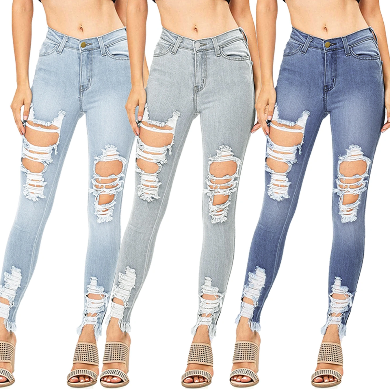 Custom Jeans Supplier Women Fashion Jeans Elastic Frayed Slim Pencil Ripped Jeans